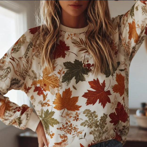 Womens Breathable Casual Long-Sleeve Crew-Neck Sweatshirt With Maple Leaf Print